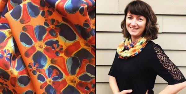 I learned that plants are her primary inspiration, which is true of the two scarves I bought. The tag accompanying “In Bloom – Burst of Color” explains: “I am an admirer of anything flora. Thousands of flower photos on my computer are the evidence. So, I committed to a watercolor drawing of a bloom, added a few computer-generated magical touches, and now you may have fresh flowers (well, almost) around your neck at all times.”