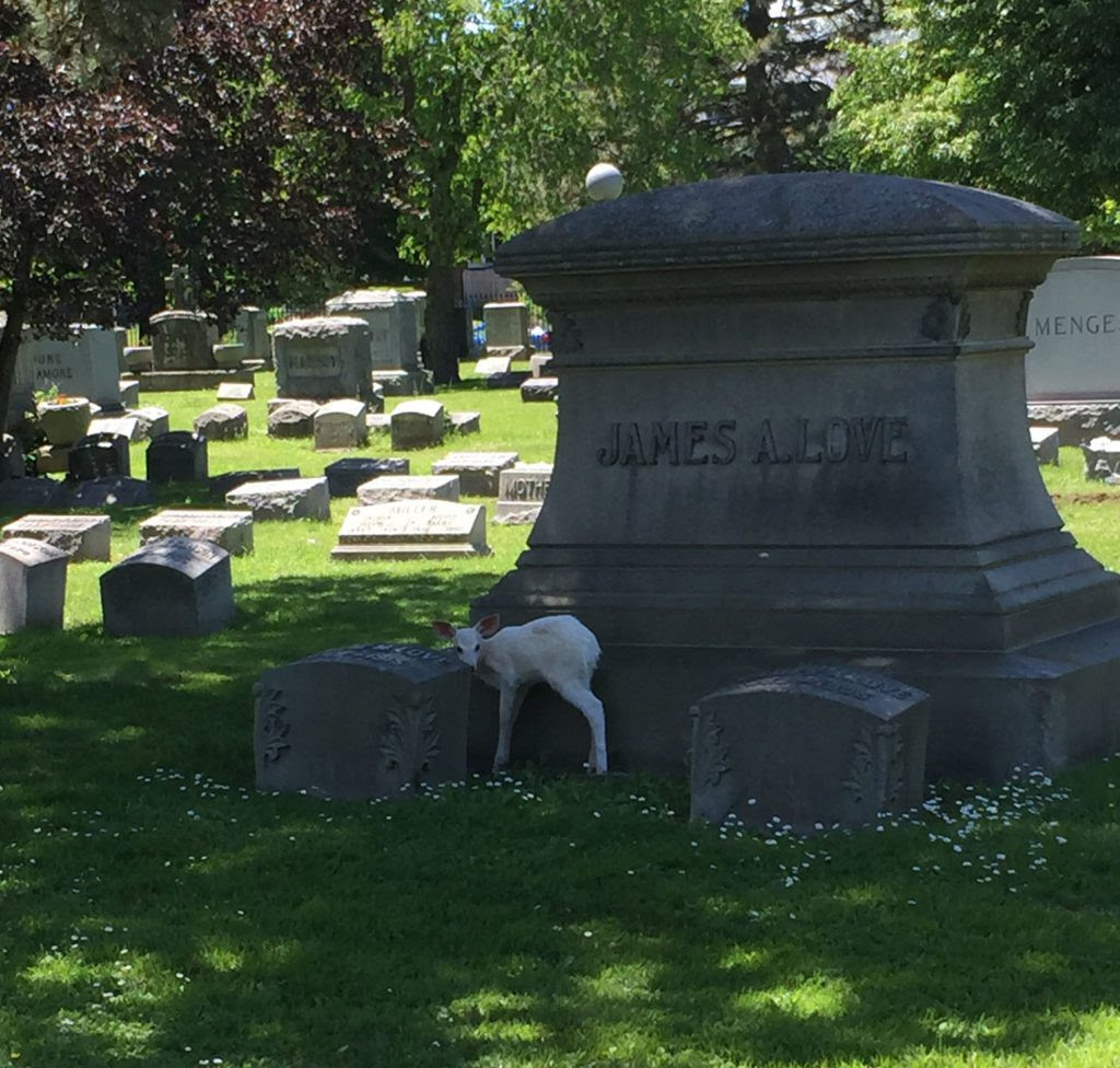 An albino fawn in Buffalo’s Forest Lawn (photo by Alan Bigelow)
